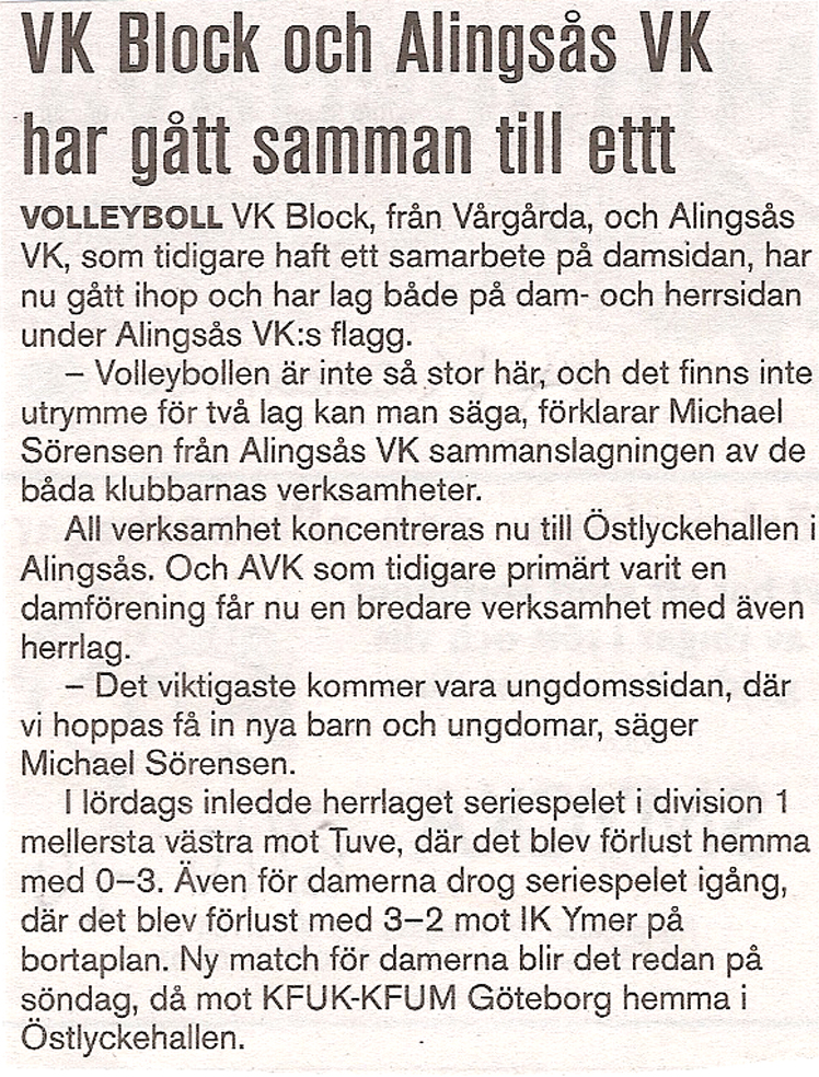 Den 11 december 2013 läser vi i Alingsås Tidning att VK Block inlett ett samarbete med Alingsås VK, som på sikt ev. kommer att resultera i en sammanslagning av de båda föreningarna. Tio månader senare, den 8 oktober 2014, finns nedanstående artikel i Alingsås Kuriren, som bekräftar att VK Block har ”flyttat” sin seniorverksamhet till Alingsås.