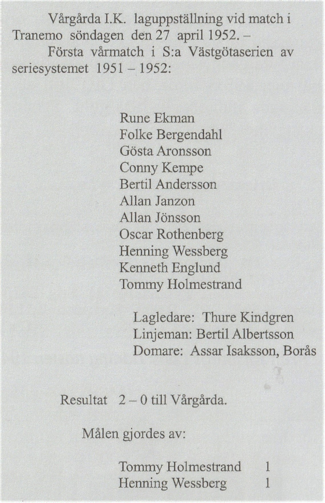 Prisutdelning för Vårgårda IK:s ”engelska liga” 1950. Ungdomarna är från vänster: Gunnar Hägerlöf, Rolf Berg, Harry Andersson, Jan Svensson, Rune Knutsson, Tommy Holmestrand, Rolf Nilsson, Cay Karlsson, Gert Berg, Gunnar Andersson och Ove Johansson. Längst till höger står Rune Ekman, initiativtagare till VIK:s ungdomssatsning. Prisutdelarna är från vänster: Rune ”Bagarn” Lindström och Nils ”Huskvarna” Andersson.
